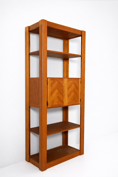 Striking and highly versatile American modular wall unit from the 1970s, showcasing robust frame construction, fine craftsmanship, and characteristic geometric veneer patterns on the cabinet doors.