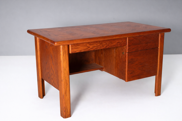 The spacious worktop offers excellent functionality for daily use, while the right-hand drawer unit provides smooth and practical storage. Rounded edges, precise joinery, and carefully considered details reflect the high manufacturing standards typical of American furniture from this era.