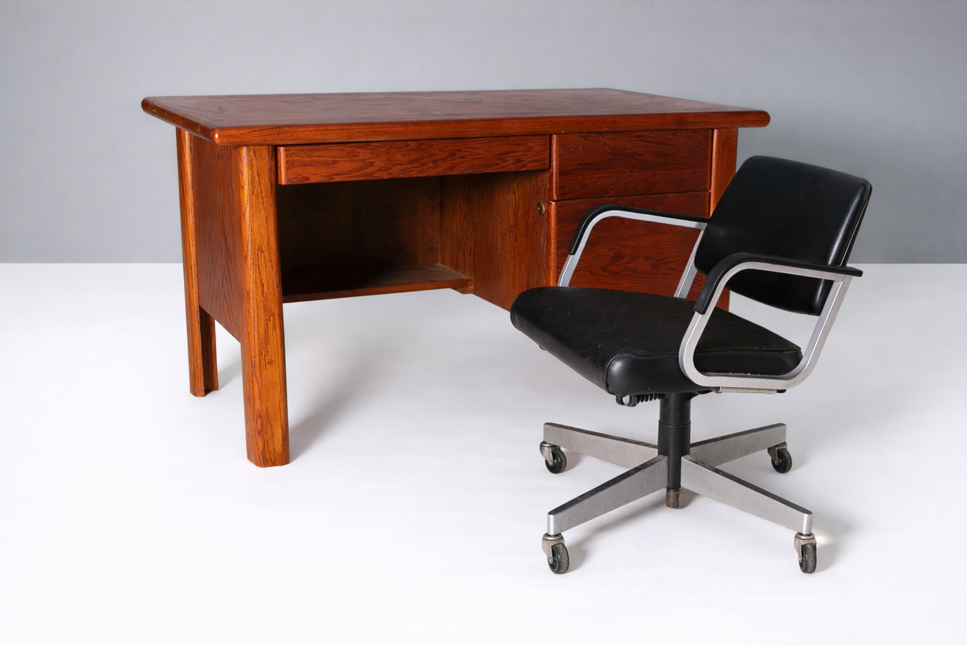 The set is completed by an original swivel office chair with a metal base, castors, and upholstered seat and backrest, perfectly complementing the desk both visually and ergonomically.