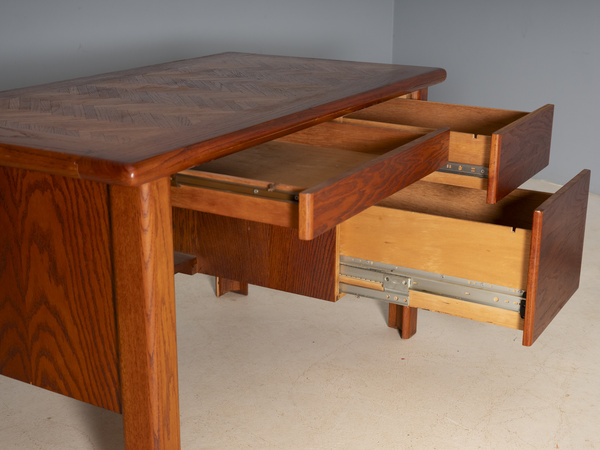 A refined American writing desk accompanied by an original period office chair, originating from a high-quality modular furniture set produced in the United States during the 1970s. The desk features strong proportions, solid construction, and a beautifully executed chevron-patterned wood veneer on the top surface.