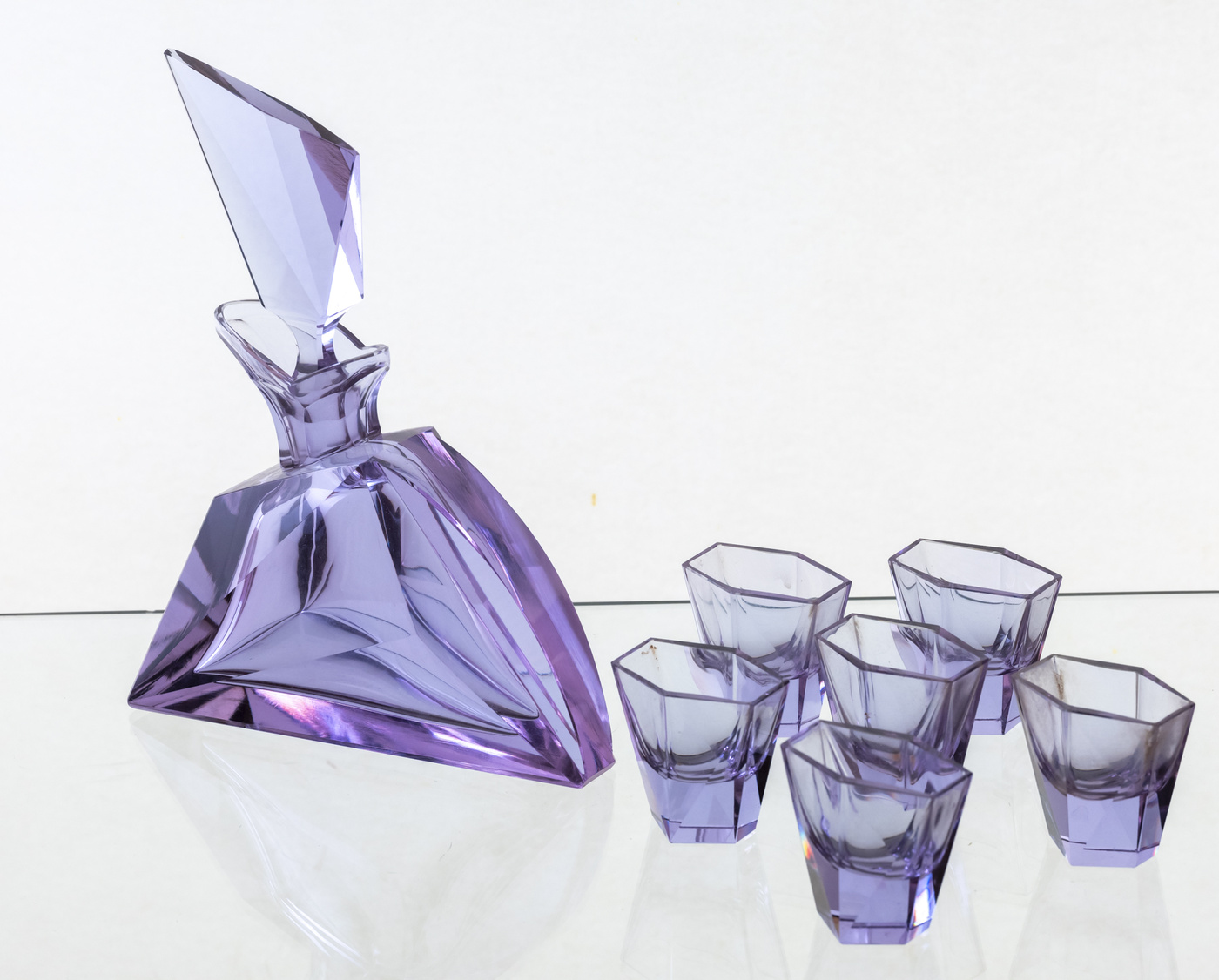 Bohemian Art Deco alexandrite glass decanter set by Moser, 1920's.