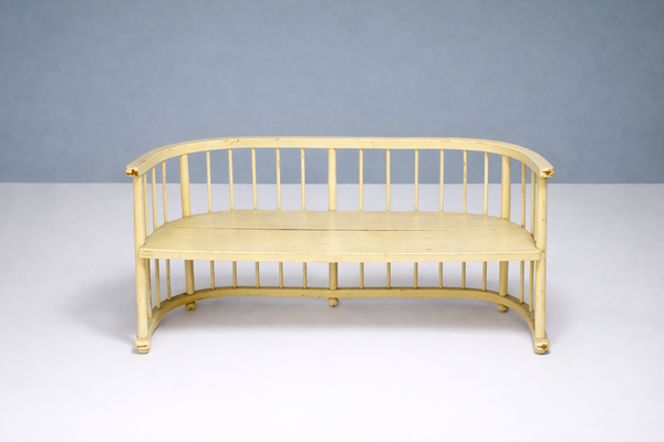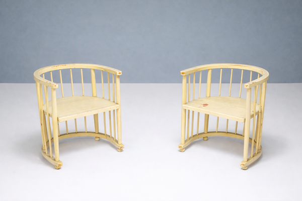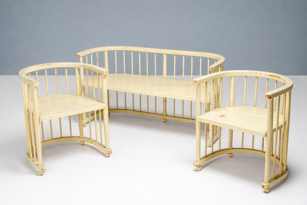 A remarkable four-piece seating ensemble from the early 1920s, consisting of two sculptural armchairs, an elegant curved bench and a delicate round table. The design features soft, rounded silhouettes, rhythmic vertical spindles and an overall architectural lightness typical of early European modernism.