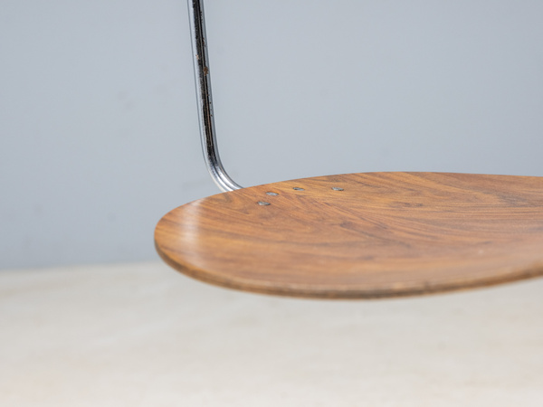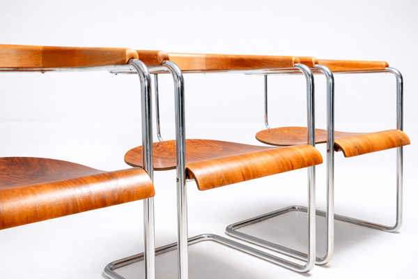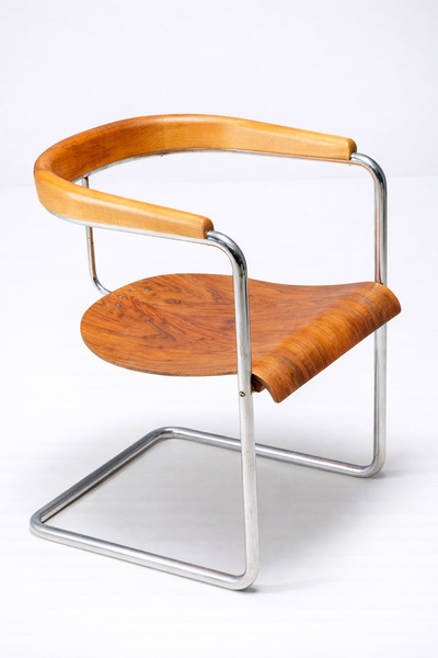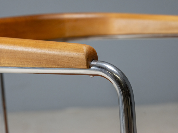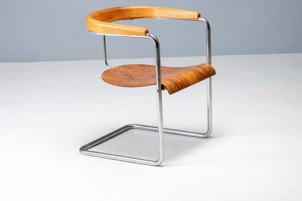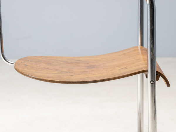 The chair, armchair features a refined combination of chromed tubular steel and bent veneered wooden elements, including the sculptural seat and distinctive curved backrest with integrated arm support. The cantilever structural principle provides elegant lightness and remarkable seating comfort.
