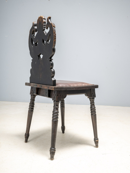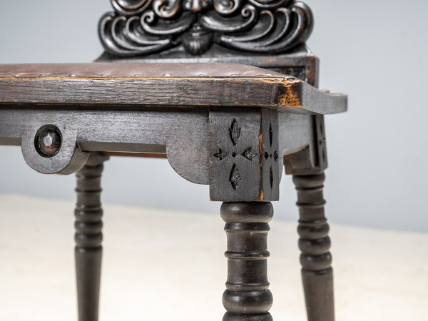 Siren and mask motifs were popular within Eclecticism and Neo-Renaissance design during the late 19th century. Chairs of this type were crafted for bourgeois interiors, salons and representative rooms, symbolizing both status and a fascination with mythological imagery. The detailed carving attests to the era’s emphasis on craftsmanship and ornamentation.Style and use