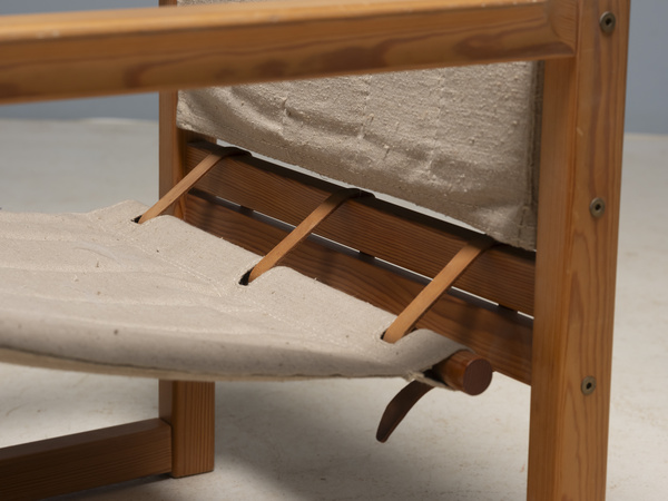 Crafted from solid pine with authentic canvas upholstery and leather strap detailing, these chairs showcase the functional simplicity and enduring appeal of Scandinavian design. The original materials have naturally aged, offering a rich vintage patina that collectors and interior enthusiasts value.