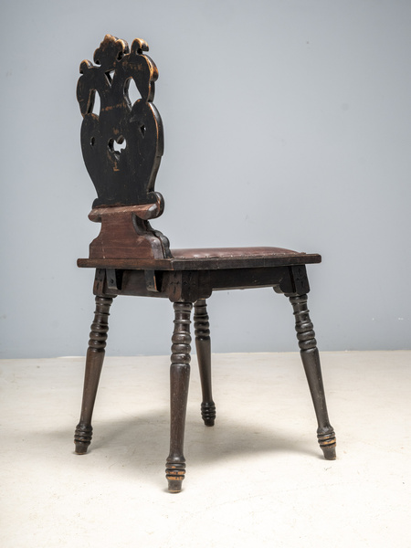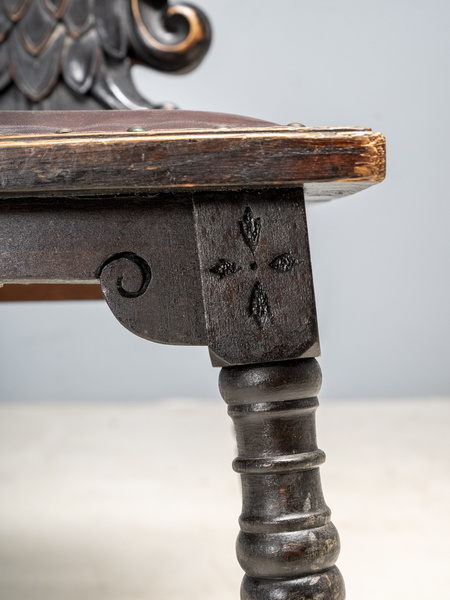 Every element of the backrest is carved by hand – from the feathers to the ornamental scrolls. The chair remains entirely original, with its natural patina, slight irregularities, and surface character reflecting its true 19th-century provenance.Technical specification