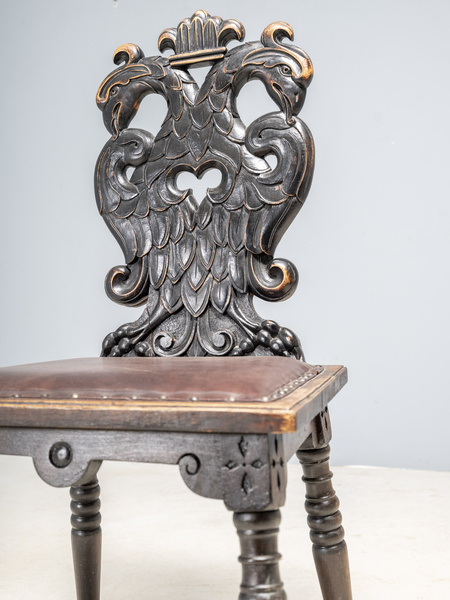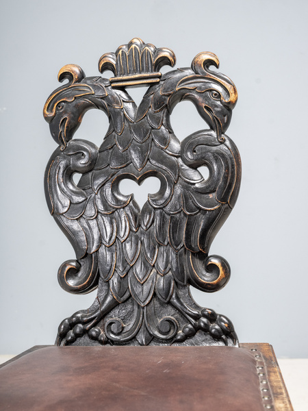 An authentic carved chair from the late 19th century, distinguished by an exceptionally detailed hand-carved backrest featuring a majestic double-headed heraldic eagle. The carving displays impressive craftsmanship with beautifully sculpted relief and a subtle aged patina that emphasizes the piece’s originality.